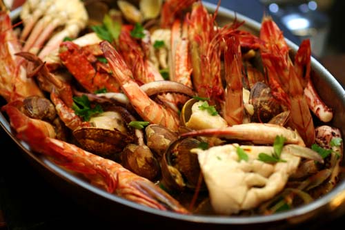 ニンニク玉ねぎのみじん切りを炒めて、蟹、海老を加えます。