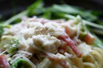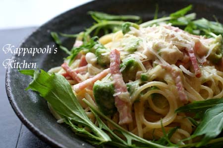 ゆで上がったパスタとサッと絡めて器に盛り、水菜、パルミジャーノチーズをすりおろします。