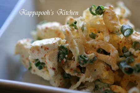 さきいかとクリームチーズを合わせて、マヨネーズ、一味で和えました。