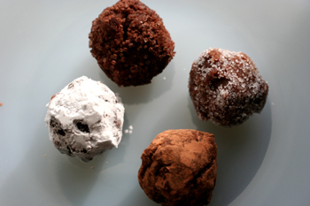 分量も適当・・。冷蔵庫に入れたら固まったので、それを丸めて、ココアパウダー、粉砂糖、グラニュー糖、シュクレショコラ(カカオパウダーにグラニュー糖が混ざったもの)をまぶしました。
