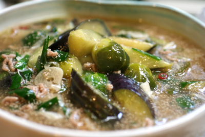 にんにくの効いたスープに素揚げした茄子がしみて美味しいです。