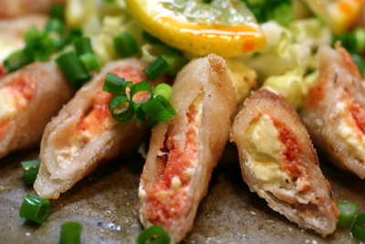 明太子とクリームチーズの組み合わせはお肉にあわせてカツにすることが多いのですが、今日は