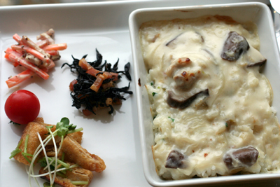 ご飯と混ぜ合わせて、耐熱容器に入れて、中華風鶏のクリーム煮をかけ、オーブントースターで