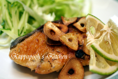 小麦粉と片栗粉を合わせたものをブリにまぶして、ガーリックを取り出したオリーブオイルで両面焼きます。