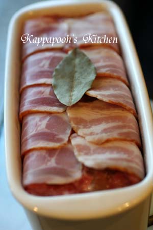 型にベーコンを敷き詰めて、合わせた肉類を入れてベーコンで包むようにしてローリエを乗せます。