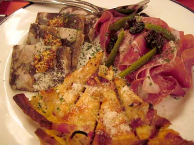 豚足入りパテ、生ハム、キッシュの盛り合わせ。