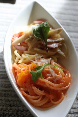 パスタはどちらも一人分強で、110gくらいでしょうか。