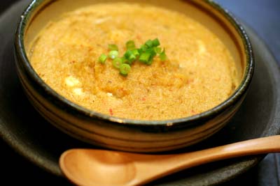 前日のキムチ鍋の残りがまだあったので、それをミキサーにかけてスープ状(ピューレ状?)にして、水、溶き卵と合わせて蒸したものです。