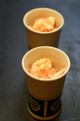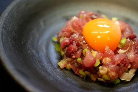 皮を剥ぐときに、うまくいかなかった部分をたたきにして、葱、生姜を混ぜて、卵黄を落として・・。