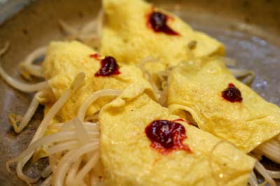 モヤシくらいならお腹への負担もないかな~と、モヤシ炒め(たけのこ入り)を薄く焼いた卵にはさんで、コチュジャンでいただきました。