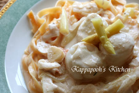 フライパンにオリーブオイルをひいて、ニンニク、玉ねぎの薄切りを炒め、ゆでて適当に切ったホワイトアスパラガス・明太子を加えて酒を入れて煮立たせます。
