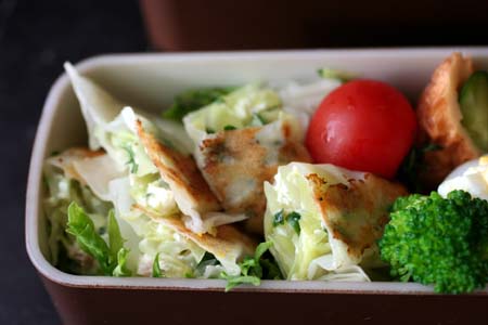 前日の夜に餃子をやったので、翌日は余った餃子の皮を使ってのお弁当を作りました。