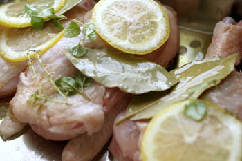 鶏の骨付きもも肉を使って、塩をして、ぶつ切りにしたお肉をレモン(果汁も一緒に)、タイム、ローリエなどで漬けておいて・・。