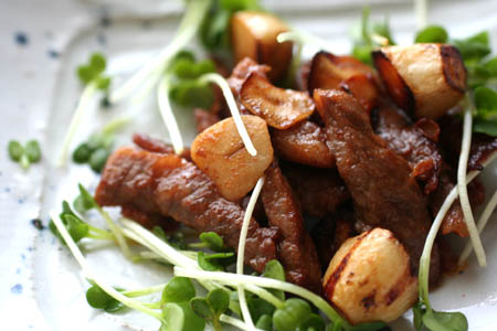 焼肉用の牛肉が少し残ってたので、細く切ってコチュジャン、酒、醤油、にんにくなどと合わせてもんで焼いたもの。