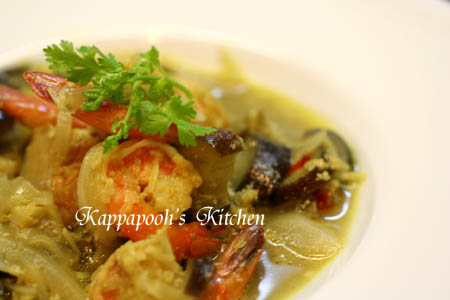 背に切れ目を入れた海老を加えて、牛乳、ココナッツロングを加えたら、クミン、ターメリックを入れ、最後にナンプラーで味を調えて出来上がり。