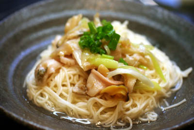 冷製パスタですが鶏肉は温かくって、冷熱なパスタ。