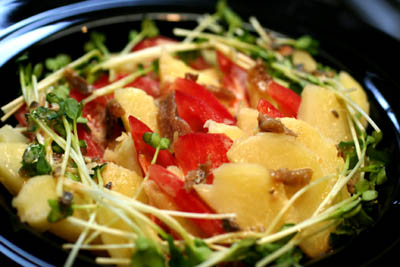 最近買った本 『WaSaBi』 の中に、じゃがいもと刺身のサラダっていうのがあって、そのサラダにトマト(だったと思う)も入ってて、へ~って思って作ったサラダです。