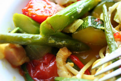 器に、野菜を盛り付け、その上にパスタを乗せて細かく切ったクリームチーズを散らしてできあがり。