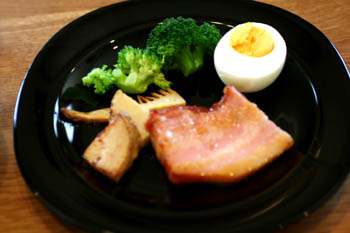 この日は、干物とか朝に出せるようなものがなかったので、ベーコン、ゆでたまご、ブロッコリー筍のバター醤油焼きと簡単なもので。