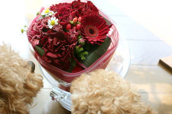 バラやガーベラ、カーネーションが全てこの深い赤です。