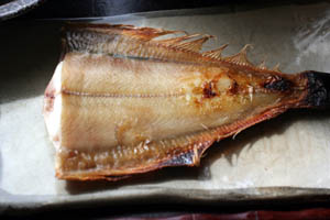 カレイの干物を焼いて・・。半身なのは1匹しかなかったので半分こにして。