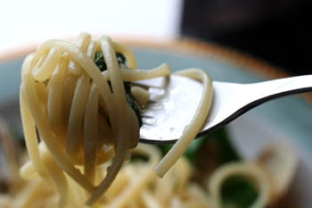 ゆで上がったパスタを合わせてソースに絡めて、塩気が足りなければ塩を足し、最後にオリーブオイルを軽くひとかけして、さらにパルメザンチーズも少し振って、出来上がり。