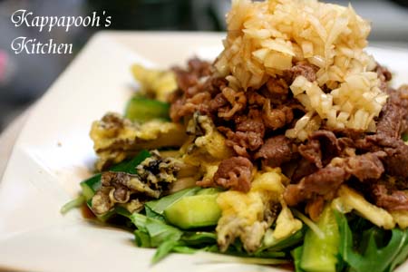 麺つゆ、醤油、酢、辛子で合わせたタレに、さらしたタマネギのみじん切りたっぷり入れて、牛肉の上からかけていただきます。