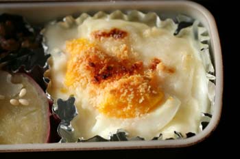 タマネギ入りのホワイトソースを作って、ゆで卵を切って合わせてアルミカップに入れてオーブントースターで焼き色をつけました。