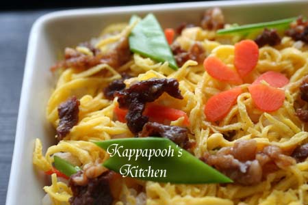 さやえんどうとニンジンは薄味で煮て、彩りにしました。