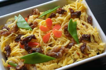 *牛肉と舞茸天のタマネギたっぷり辛子ダレ和え*