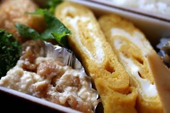 ポテトサラダと、煮物、玉子焼き(明太和え)、これにおにぎりを夫には作りました。