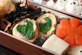 油揚げは甘辛く煮て、汁気をしぼって、端を3箇所切って開き、ほうれん草をまとめて巻きます。