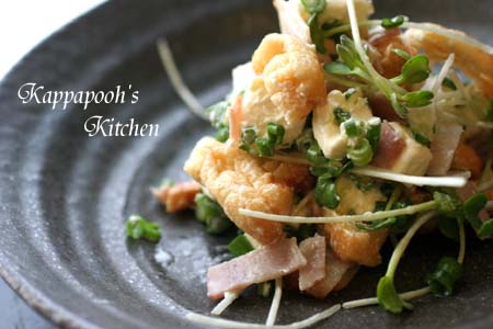 クリームチーズをさいの目に切って、油揚げ、ベーコン、きざみネギ、カイワレと合わせて、天然塩、レモンの絞り汁で和えます。