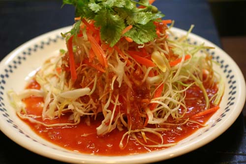 たっぷりの玉ねぎの入ったドレッシングにチリソース、ナンプラーを加えて辛いサラダです。