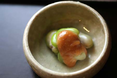 そら豆が二さやあったので、ゆでて酢味噌和えにしました。