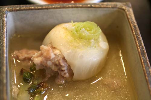かぶにスプーンで穴を開けて、そのときに出たかぶも細かく切って豚肉と合わせて卵白、片栗粉を加えて混ぜたものです。