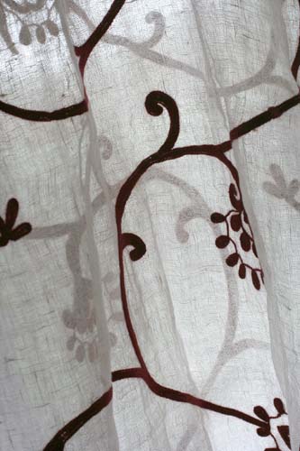 赤い模様は刺繍でできています。透け感のある麻っぽい生地に赤がなんとも大人っぽい。