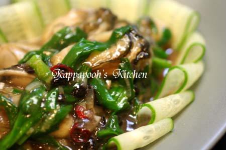 ピーラーで薄く剥いたきゅうりを器に並べて、牡蠣のトウチ炒めを盛り付けて出来上がり。