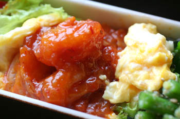 味付けの濃い中華なので、卵は味つけなしで、ふわっと焼いて、エビチリに添えました。