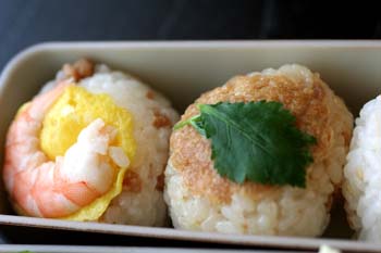 酢飯を作り、白ごま、鶏そぼろを混ぜこみ、ラップを使って海老、卵、酢飯の順で乗せて丸く絞って形をつくります。