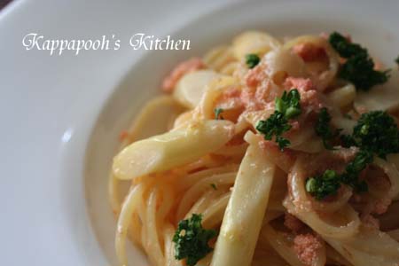 今日のホワイトアスパラのパスタ。 明太子との相性もGood!でおいしそう~~~
