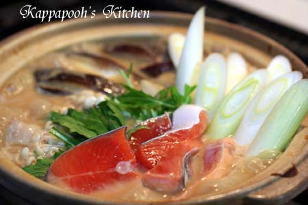 後は、和風だし、白味噌、酒粕で味付けして、鮭と鶏肉を入れました。