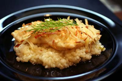 お皿にリゾット、鱈、ジャガイモを盛り付け出来上がり。