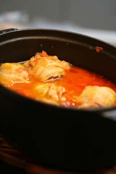 玉ネギ、ニンジン、ニンニクのみじん切りをオリーブオイルで炒めて、塩ワイン、水を加え、ホールトマトをくずして入れ、コンソメと鶏ガラスープで煮ました。