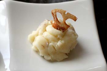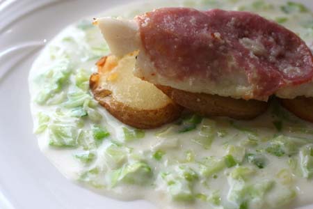 別のフライパンで電子レンジで加熱し、輪切りにしたジャガイモをこんがりと焼き、器にクリームソース、ジャガイモ、鱈を盛り付けて出来上がり。