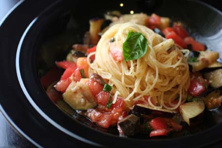 *アンチョビ・オリーブ入り茄子とトマトの冷製カッペリーニ*