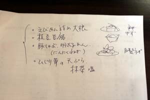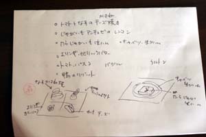 食材をチェックして、それでできるものを考えると同時に盛り付けのイメージ・・そして忘れがちな添え物の食材などをメモします。