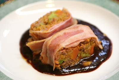 ソースの上に切り分けたかぼちゃ入りミートローフを盛り付けます。