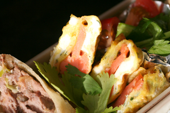 卵には、鮭のふりかけを入れて味付け。中にスモークサーモンを巻きこんで。