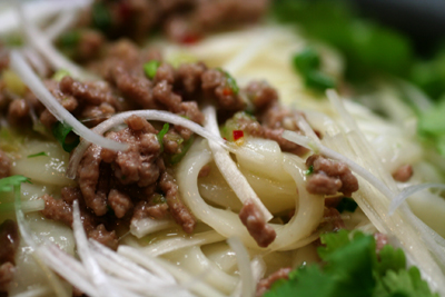 さらにゆでた麺を(120gほど)よく湯きりして合わせて、白髪ネギ(2分の1本分)、パクチー適量を合わせて出来上がり。